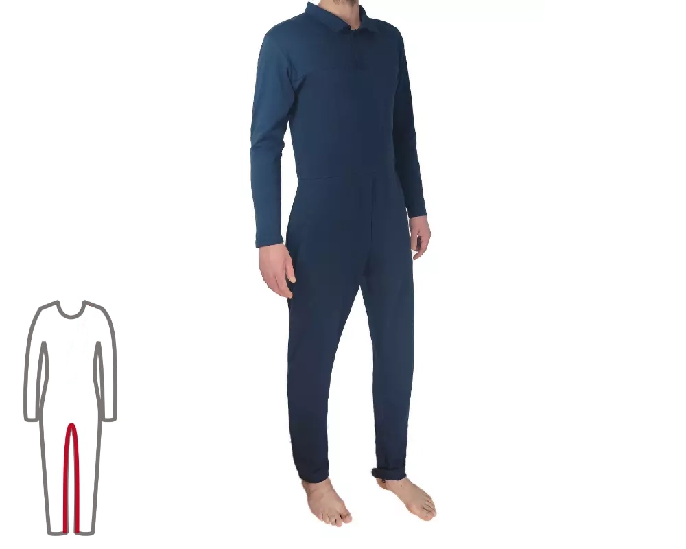 La grenouillère pour homme ActivePro vous aide à prendre soin de vos proches, de vos résidents et des patients atteints de démence. Elle est extrêmement confortable et de haute qualité. La fermeture éclair située aux jambes facilite l'habillage et le changement des protections d'incontinence. Cette dernière est sécurisée et la probabilité de se déshabiller soi-même est nettement réduite. Le design se distingue des combinaisons au look médical traditionnel. La grenouillère convainc donc non seulement par son confort particulièrement élevé, mais aussi par son aspect visuel.