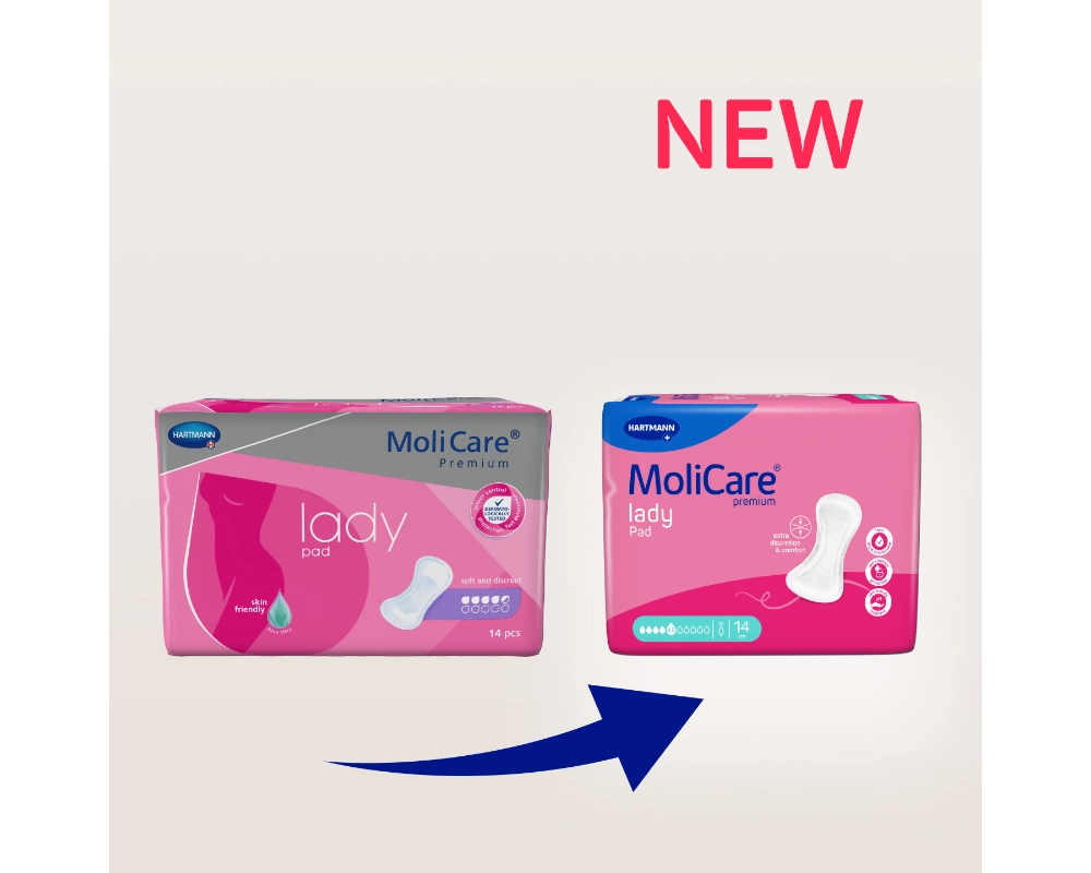 Veuillez noter que la gamme MoliCare® premium lady Pad a été repensée pour offrir davantage de discrétion et un meilleur confort. Les dimensions du produit peuvent varier. Le design de l’emballage a été actualisé.